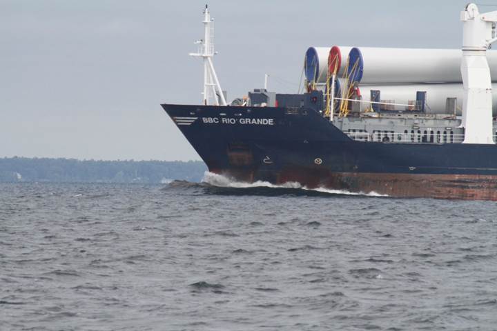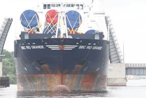 The above freighter which hauls wind turbine parts later actually anchored in the bay waiting for the wind to die down so a tug could pull it upriver. Here it’s passing us and a little later we passed it just past the drawbridge. It was quite a shoehorning operation watching this just fit within the confines of the Ogden St. Bridge.